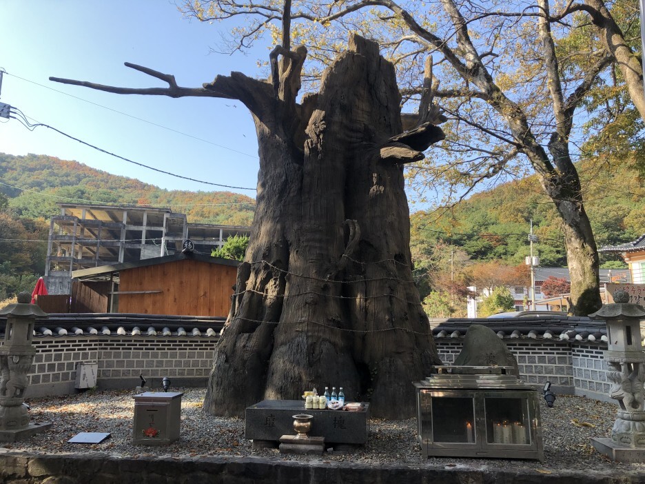 충청남도 공주시 계룡면 갑사 입구 황매화가 화려하게 피어나는 갑사동 용천교 입구에는 수령이 1600여 년이 넘은 괴목이 있었는데 갑사의 창건과 거의 역사를 같이 한 이 괴목은 임진왜란 때에는 최초의 승병장이었던 영규대사와 많은 승병들이 모여 그 나무 그늘 아래에서 왜군을 퇴치할 작전을 세우기도 했던 호국불교를 증거하는 신수(神樹)이기도 하다.