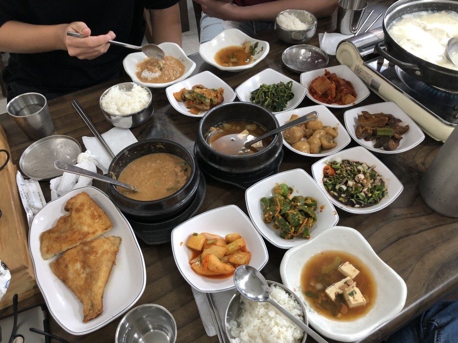 8가지 나물들과 생선, 그리고 비지장과 된장찌게까지 한상이 차려집니다.