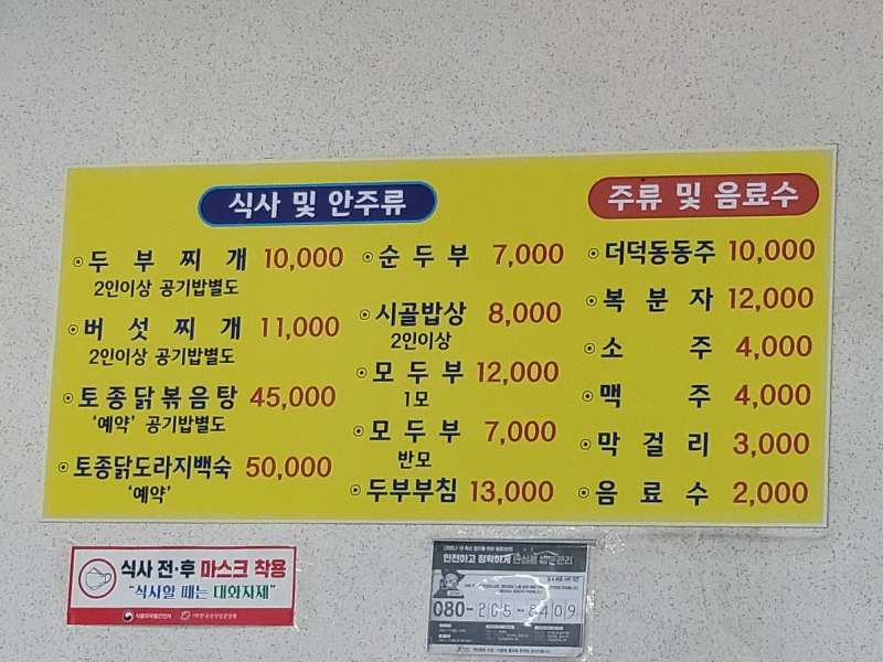 이곳의 인기 메뉴는 시골밥상, 버섯찌개, 두부찌개, 백숙 이라고 합니다.