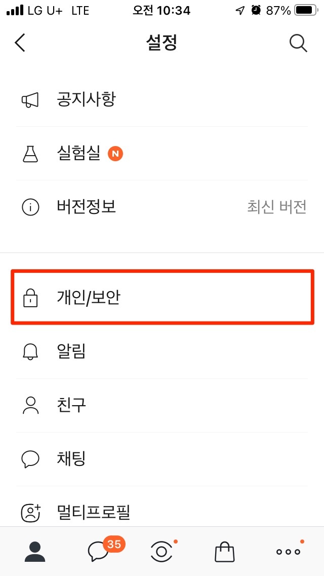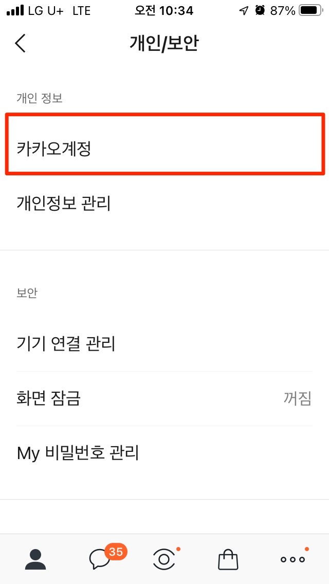[개인/보안 > 카카오계정] 메뉴로 들어갑니다.