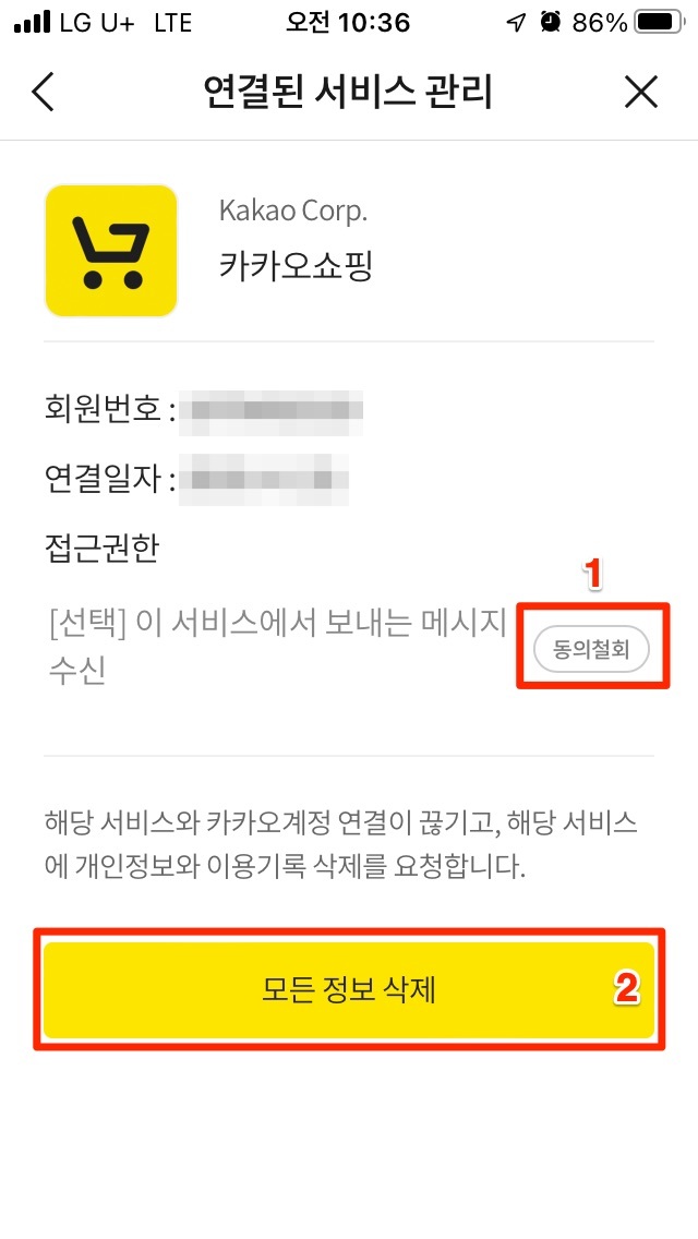 더이상 연결을 원하지 않는 서비스를 선택하고 메시지 수신 [동의철회]나 [모든 정보 삭제]를 클릭합니다.