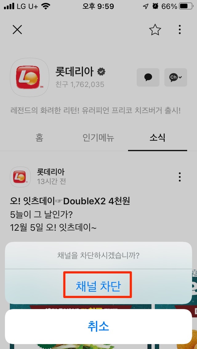 우측에 [Ch]라고 적혀있는 아이콘을 클릭한 후, 채널차단 메뉴를 선택하면 됩니다.