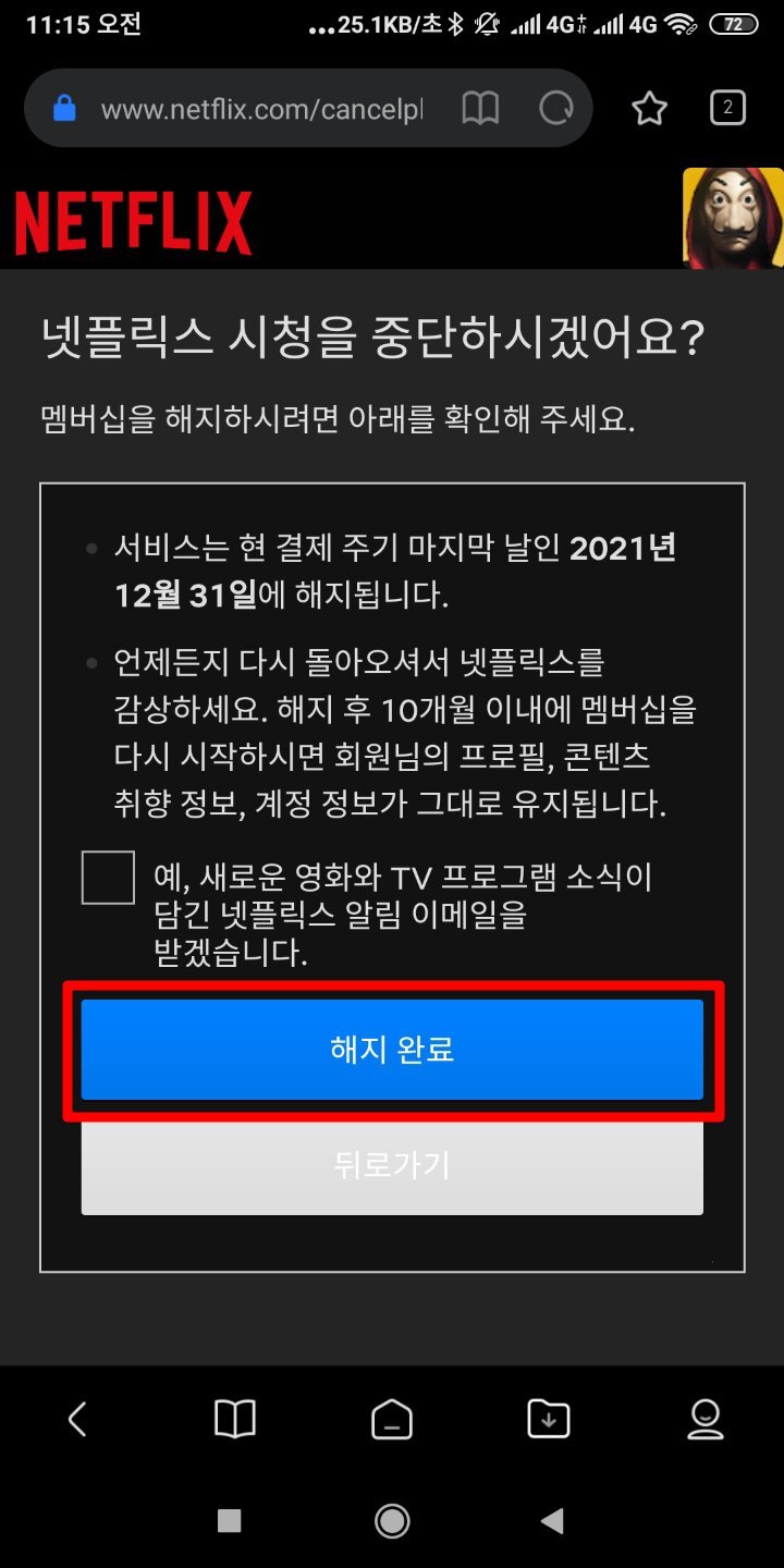 여기서 한번 더 [해지 완료] 버튼을 클릭하면 해지가 완료됩니다.
