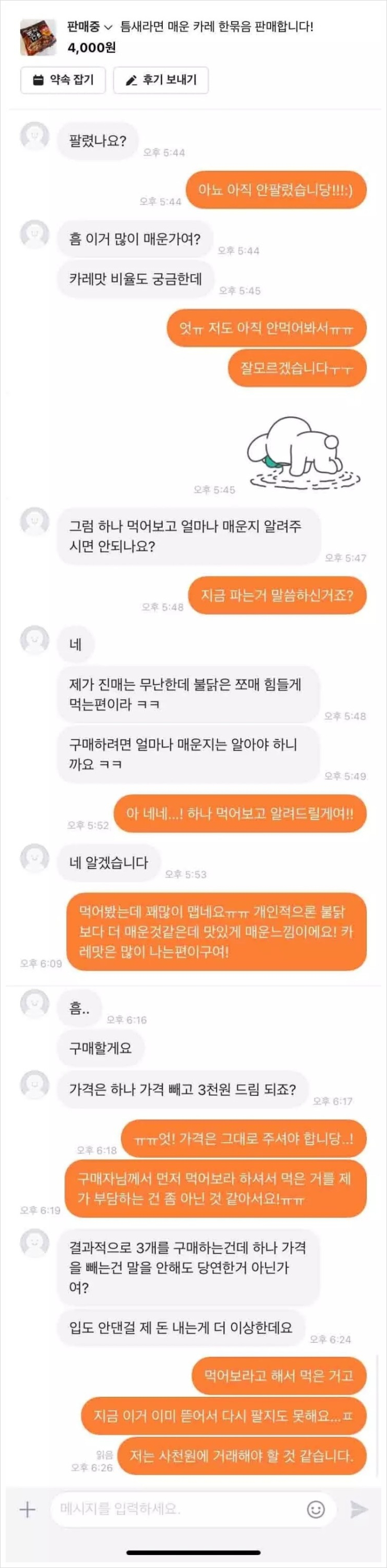 그걸 판매자에게 먹어보고 말해달라고 요구하는 구매자가 우선 너무한 것 같고...