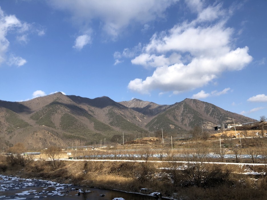눈덮힌 산의 풍경이 산수와 같이 보입니다.