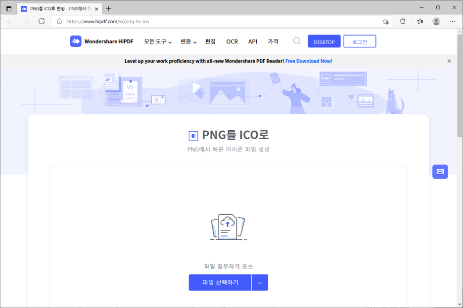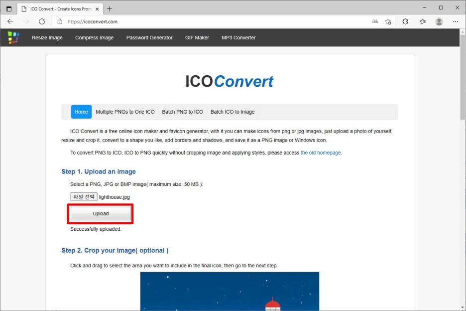 기본적으로는 PNG를 ICO로 변환합니다. 그러므로 PNG 파일이 아닌 다른 파일을 업로드하면 변환이 안됩니다.
