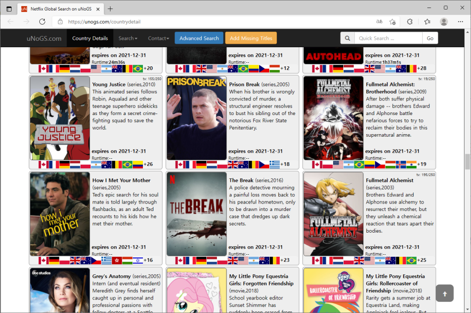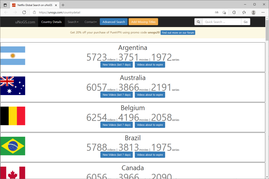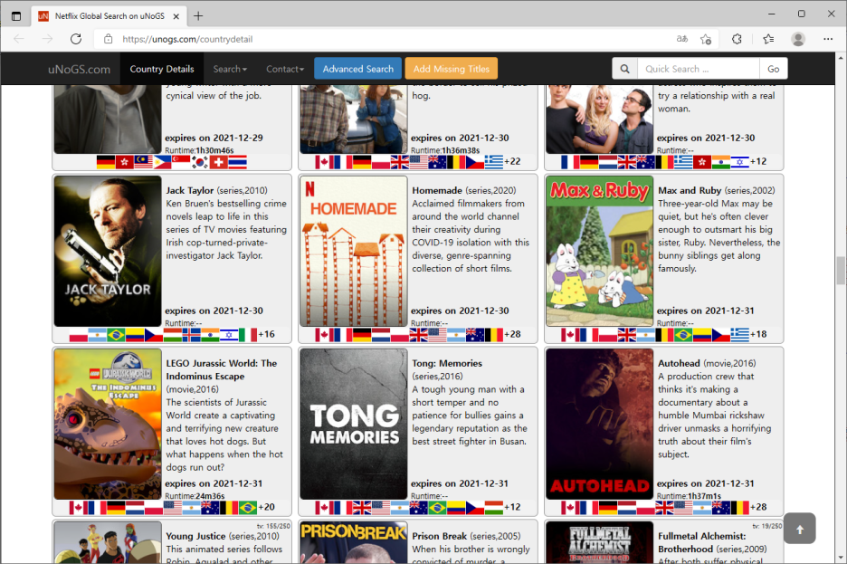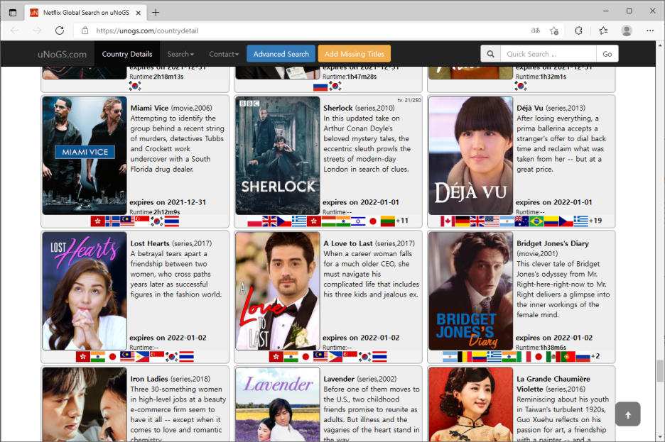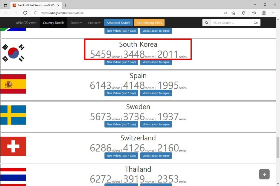각 나라별로 서비스되는 영화와 드라마가 정리되어 있습니다.