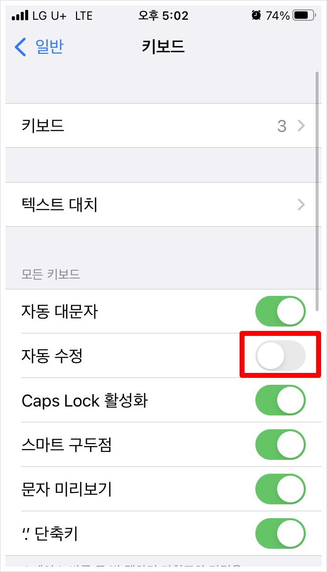 아이폰에서 텍스트 자동 수정 해제하기