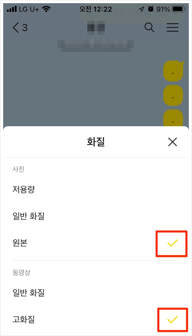 이제 앞으로 보내는 사진은 모두 원본 화질로, 동영상은 고화질로 보내게 됩니다.