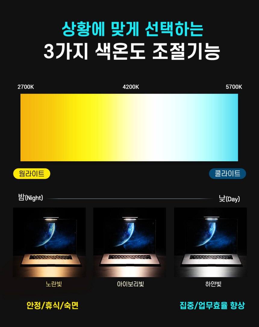 - 상황에 맞는 색온도 조절로 눈의 피로도를 줄일 수 있다.