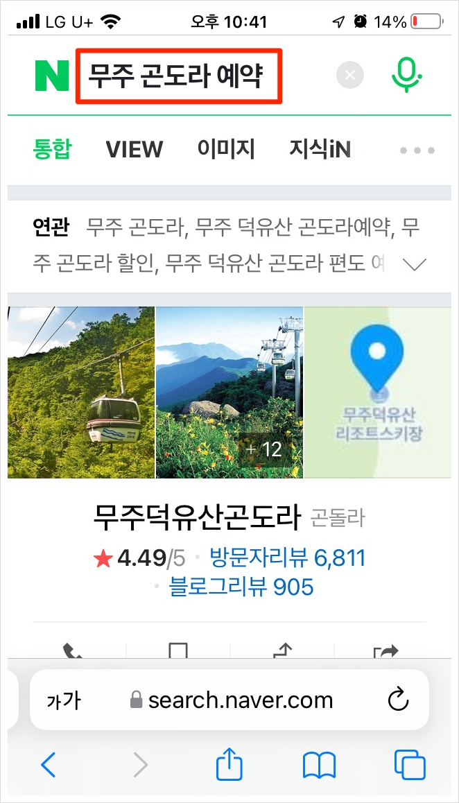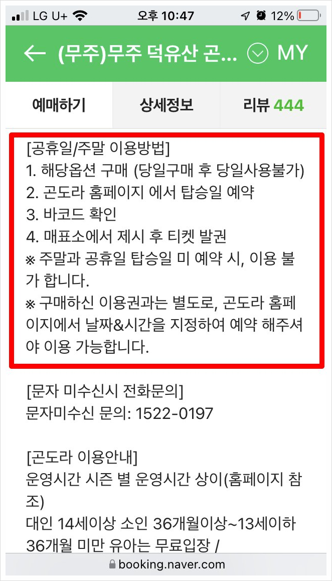 우선 네이버에서 '무주 곤도라 예약'을 검색한 후, 아래로 내려서 [예매] 항목에서 주중 또는 주말을 선택합니다.