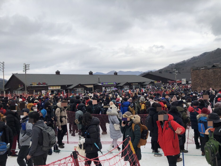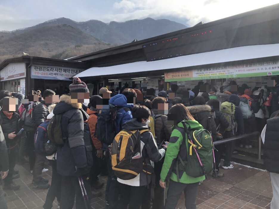 곤도라 티켓을 받으려는 사람들로 북새통을 이룹니다.