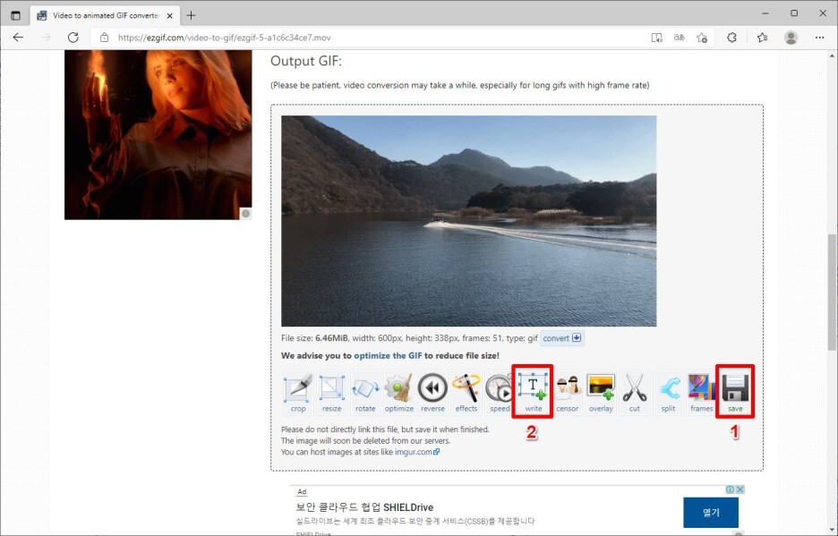 [Save] 버튼을 클릭하여 움짤을 저장하면 됩니다.