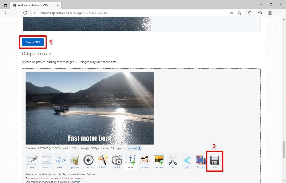 원하는 프레임에 원하는 자막을 넣은 후 [Create GIF!] 버튼을 클릭하면 움짤이 만들어 지면, [Save] 버튼을 클릭하여 이미지를 저장합니다.