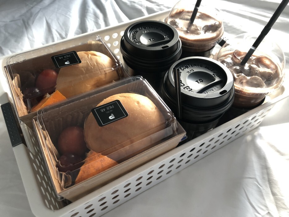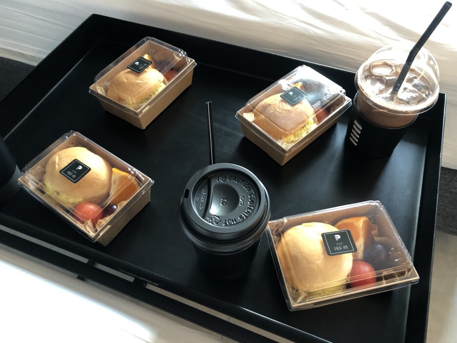 에그마요 샌드위치, 약간의 과일, 음료로 구성된 조식이라 배부르게 먹기에는 부족하지만 아침 허기를 달래기에는 충분한 양인것 같습니다.