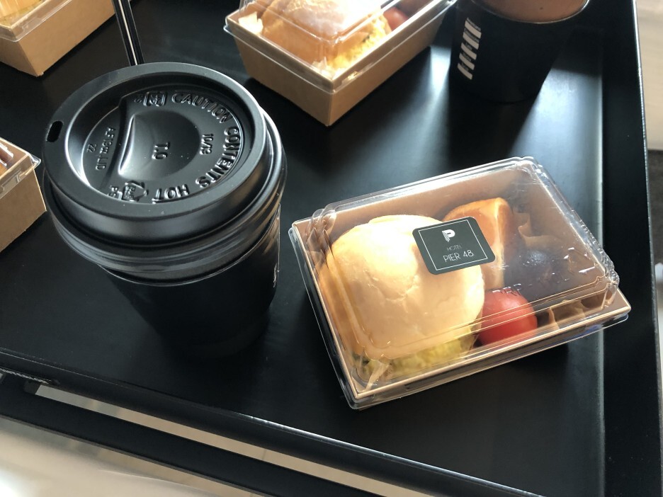 에그마요 샌드위치, 약간의 과일, 음료로 구성된 조식이라 배부르게 먹기에는 부족하지만 아침 허기를 달래기에는 충분한 양인것 같습니다.