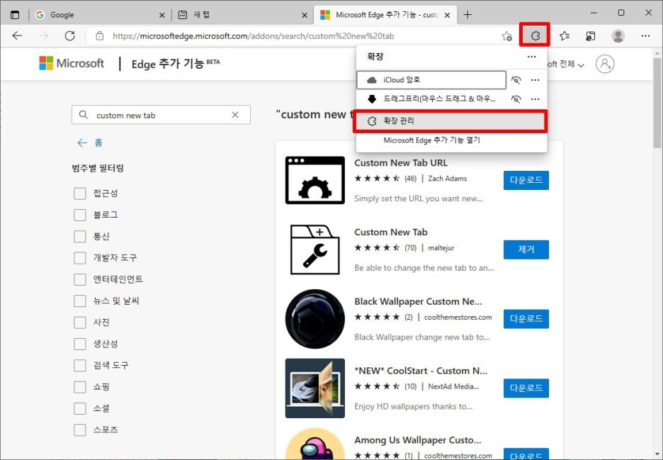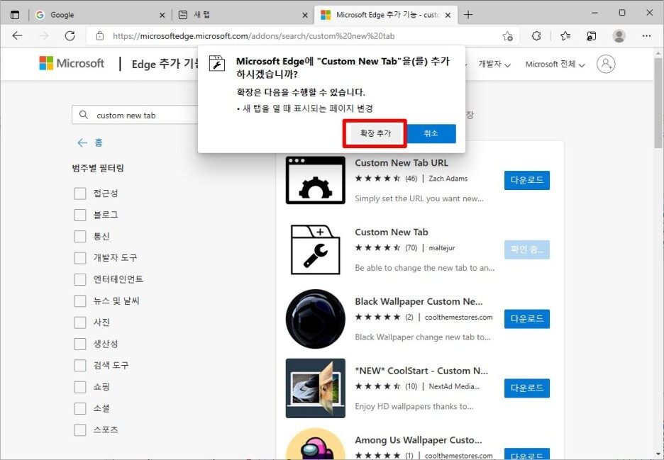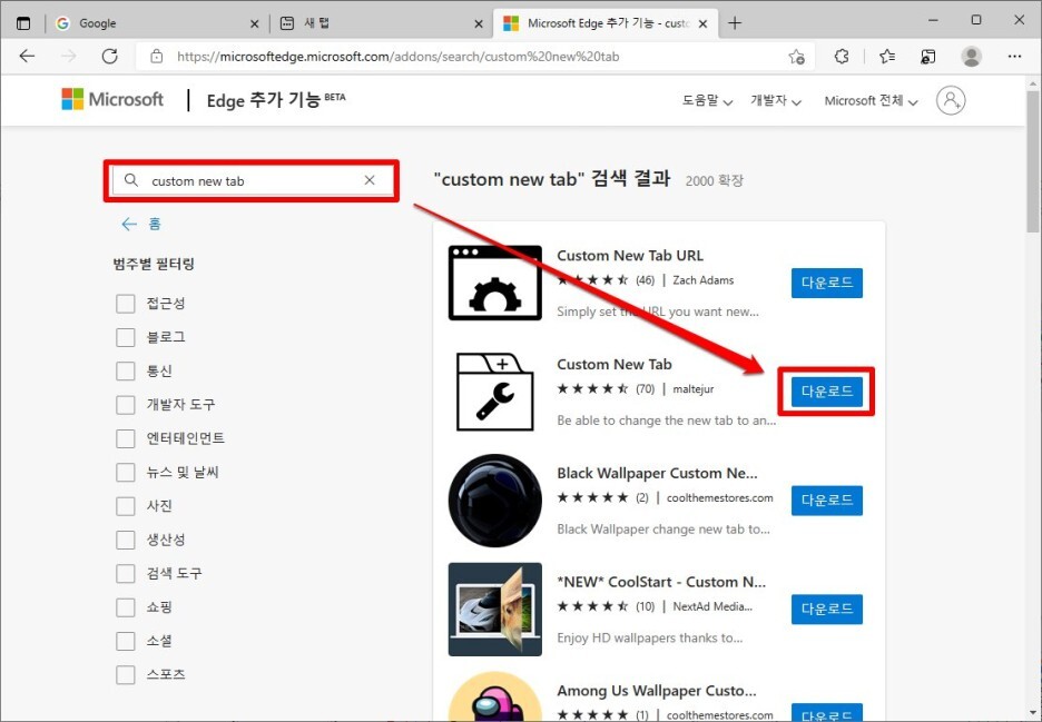검색창에서 "custom new tab"을 검색한 후, 두번째 아이콘을 확인한 후 [다운로드] 버튼을 클릭합니다.