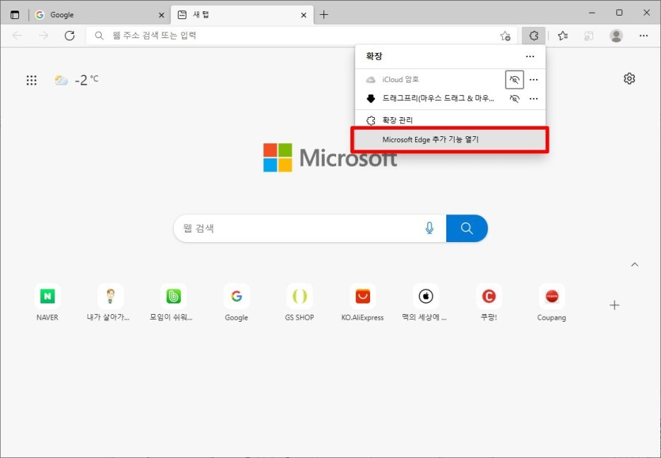 마이크로소프트 엣지의 시작페이지를 구글로 변경하여 사용하고 있지만, 새탭을 열면 Bing 검색창이 있는 엣지의 기본 새탭 페이지가 열립니다.