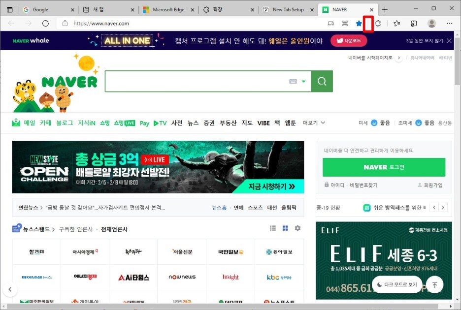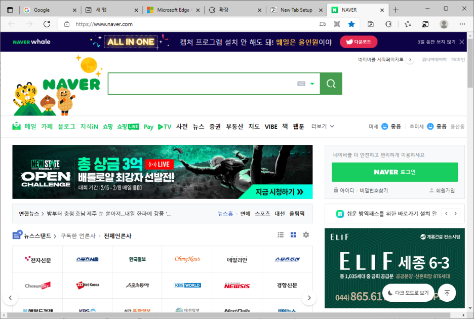 이제 새탭을 생성하면 네이버 사이트가 열리는것을 볼 수 있습니다.