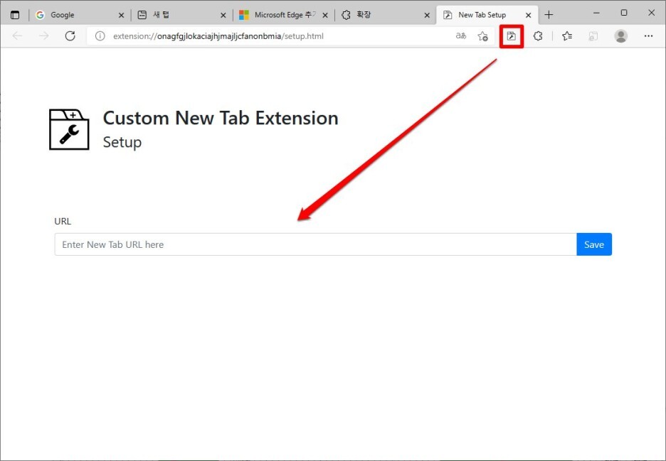새탭을 열었을때 보일 사이트의 주소를 입력한 후 [Save] 버튼을 클릭합니다.