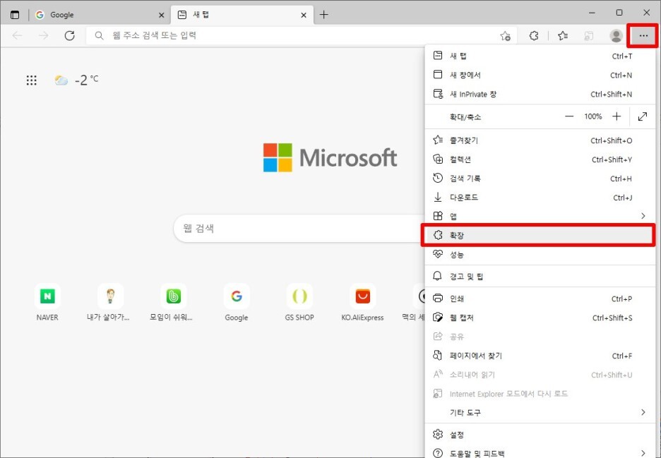 엣지의 오른쪽 상단 [...] 아이콘을 클릭한 후 [확장]을 선택합니다.