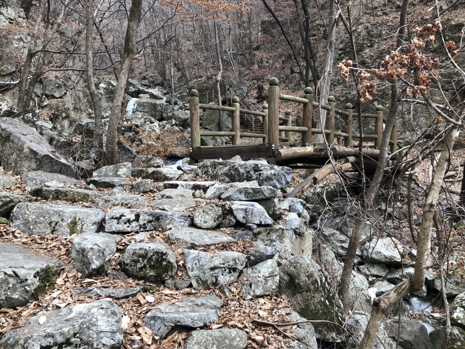 얼어붙어 있는 약수터를 지나 계단이 나옵니다.