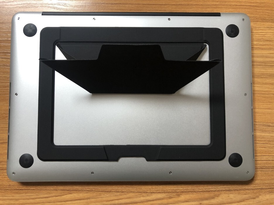 하지만 이번에 리뷰할 제품은 노트북 밑면에 붙여 놓은 후 노트북을 사용할 때 종이접기를 하듯 간단히 접어서 노트북을 세우면 되는 제품입니다.