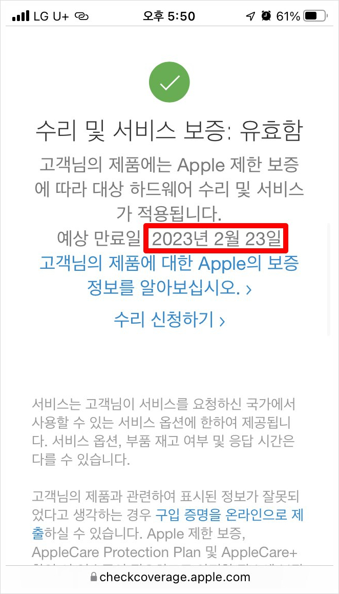 이제 구입일이나 전화기술지원, 수리 및 서비스 보증 모두 유효하다고 나옵니다.