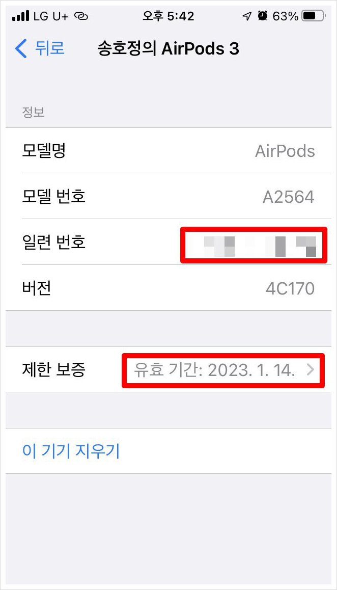 일련 번호는 아이폰>설정>블루투스>에어팟 으로 들어가면 확인할 수 있습니다.