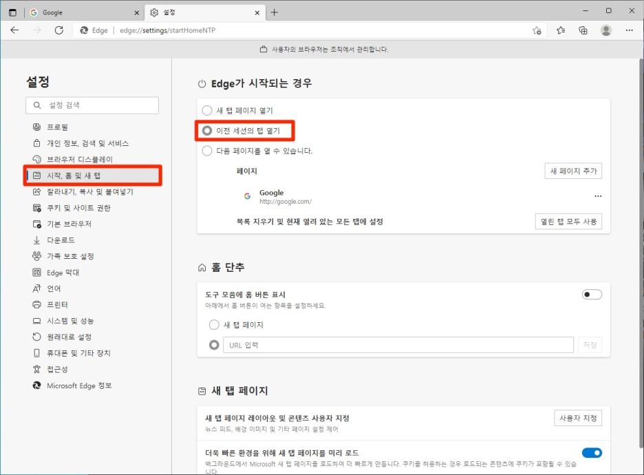 마이크로소프트 엣지(Edge) 마지막 보던 페이지(탭) 자동으로 열기