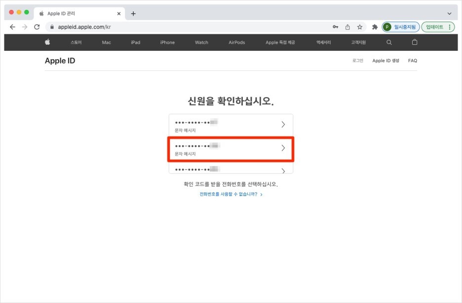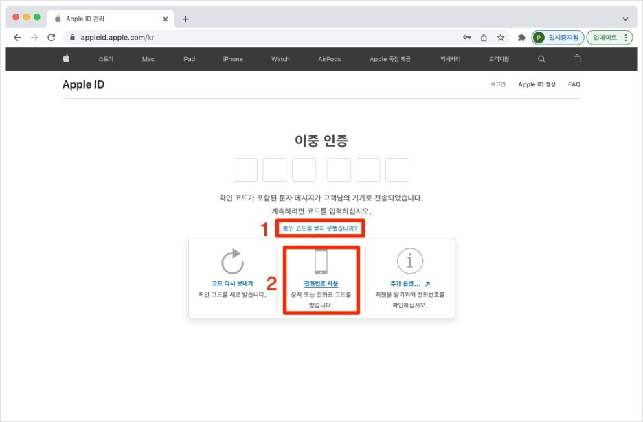 만일 메시지를 받지 못했다면, [확인 코드를 받지 못했습니까?]를 클릭한 후 [전화번호 사용]을 클릭합니다.