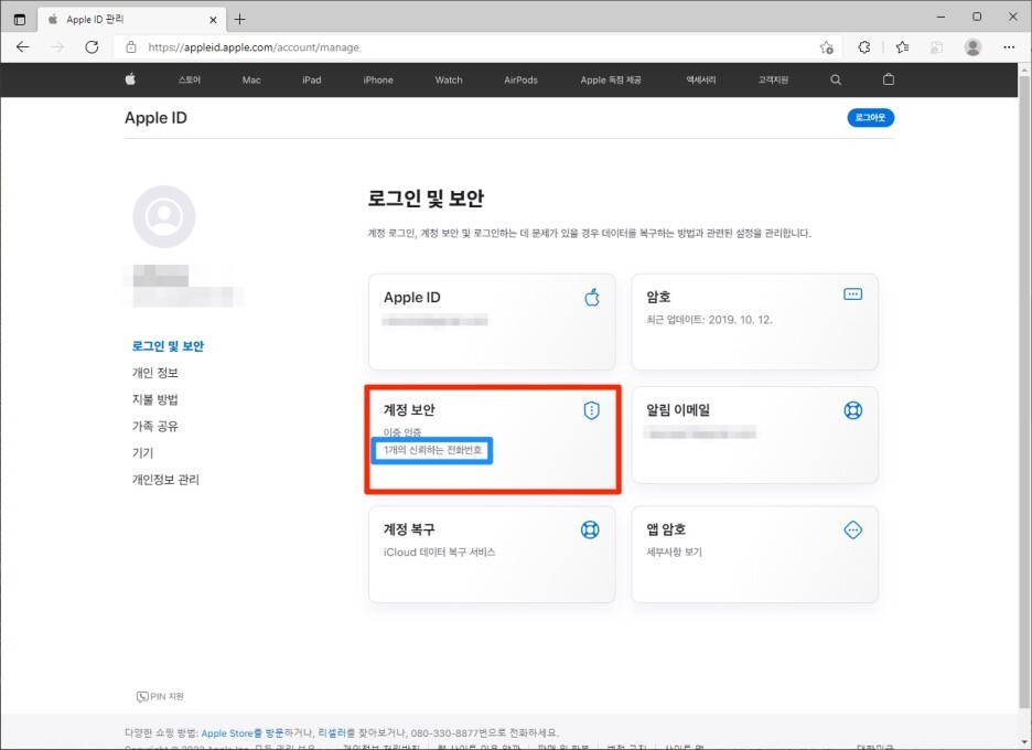 [로그인 및 보안]에서 [계정 보안]의 '이중인증'에 1개의 신뢰하는 전화번호가 등록되어 있습니다.