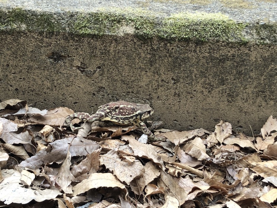 도로 옆 벽을 넘지 못해 헤메이고 있는 두꺼비를 숲쪽으로 넘겨주었습니다.