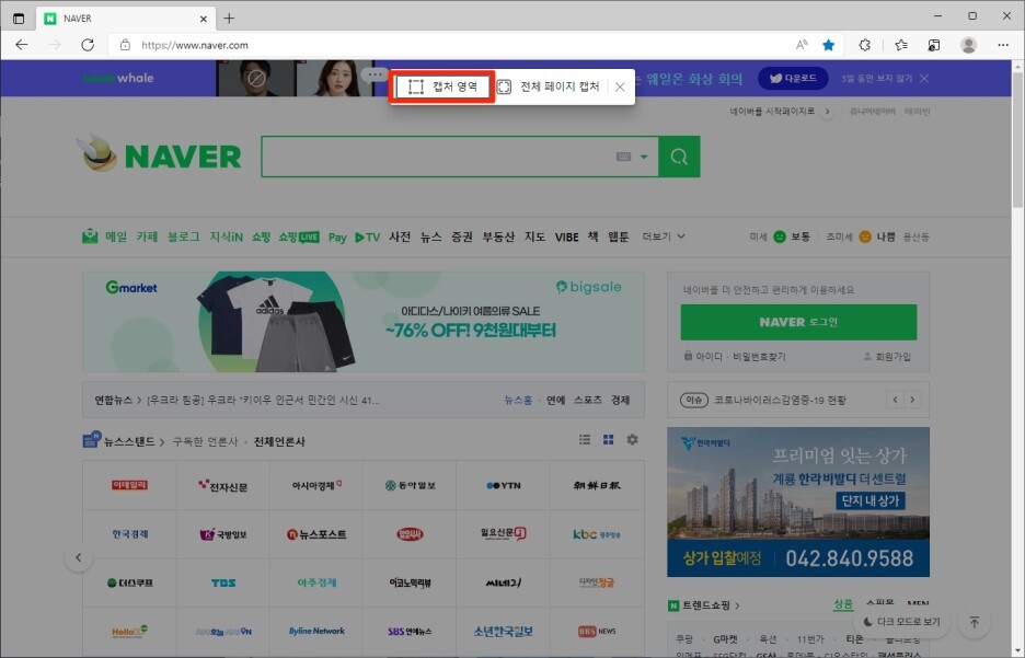 웹 캡처는 [캡처 영역]와 [전체 페이지 캡처] 두가지 기능이 있습니다.