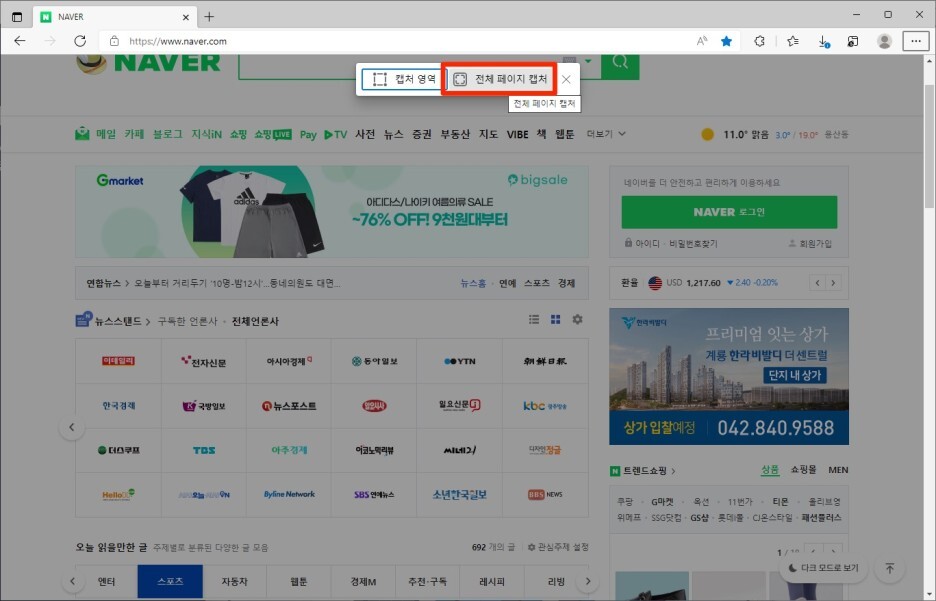 전체 페이지 캡처 기능도 보동 확장 프로그램을 사용하여 캡처 하였는데 엣지에서 기본적으로 제공해주므로 아주 편리합니다.