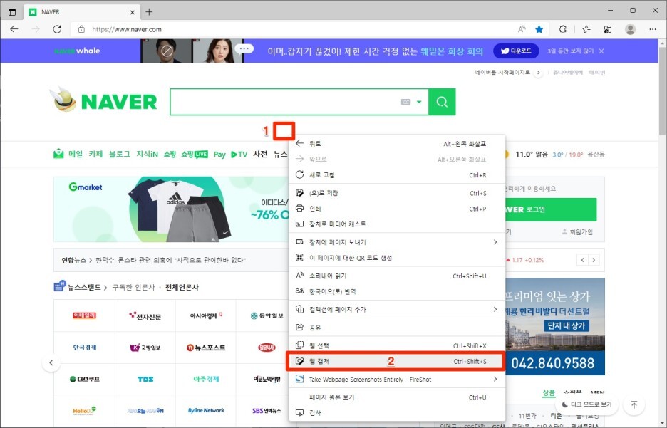 엣지에서 웹서핑을 하다가 캡처하고자 하는 화면이 나오면 아무 빈 곳을 마우스 오른쪽 버튼으로 클릭한 후, 나오는 메뉴 중 아래부분의 [웹 캡처]를 선택합니다. 단축키는 [Ctrl + Shift + S] 입니다.