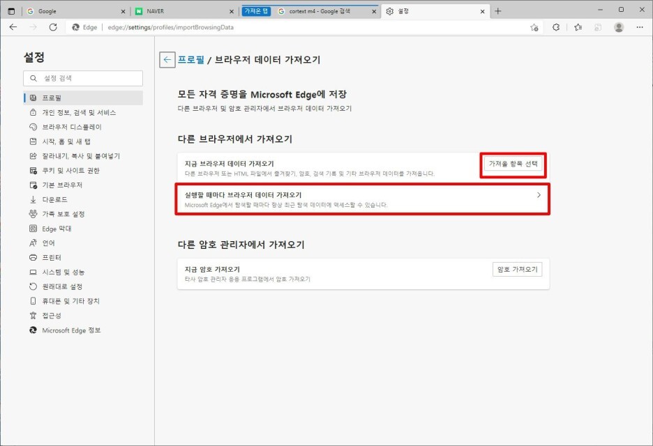 왼쪽 메뉴의 [프로필]을 선택한 후, [브라우저 데이터 가져오기]를 선택합니다.
