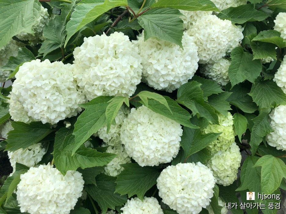 불두화(꽃의 모양이 부처의 머리처럼 곱슬곱슬하고 부처가 태어난 4월 초파일을 전후해 꽃이 만발해서 불두화라고 함; 수국인줄 알았는데 아니네요... 나뭇잎 모양이 달라요...ㅎ)