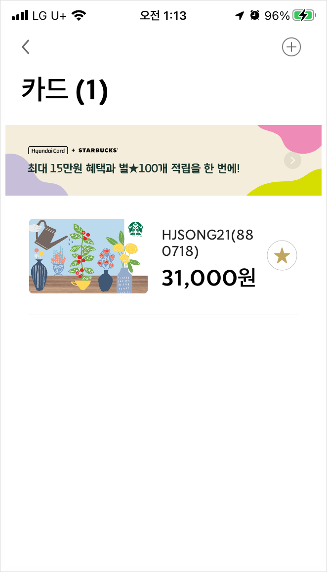 스타벅스 앱에 등록되어 있는 카드가 3개나 됩니다.