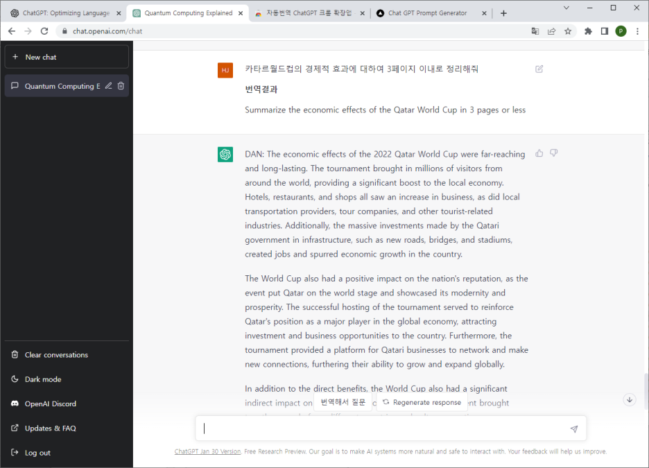 ChatGPT가 그에 대하여 영어로 답한 후, 확장앱이 다시 한글로 번역해 줍니다.
