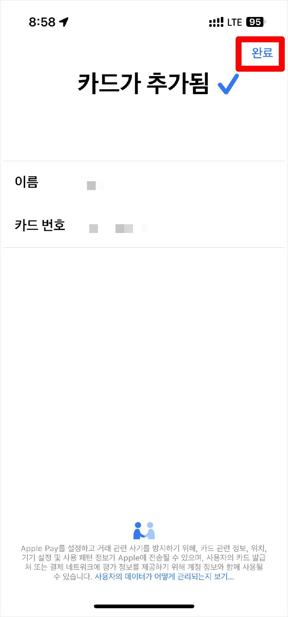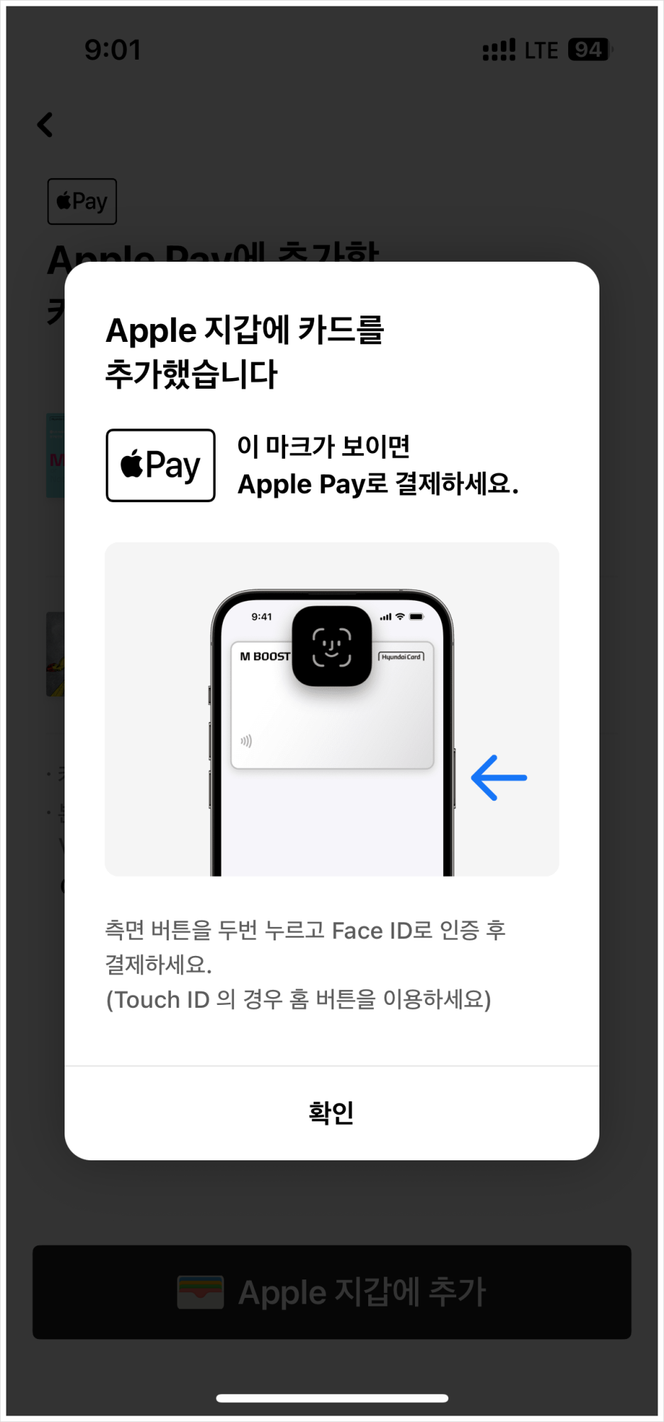 이제 측면 버튼을 두번 누르면 애플페이를 사용할 수 있습니다.
