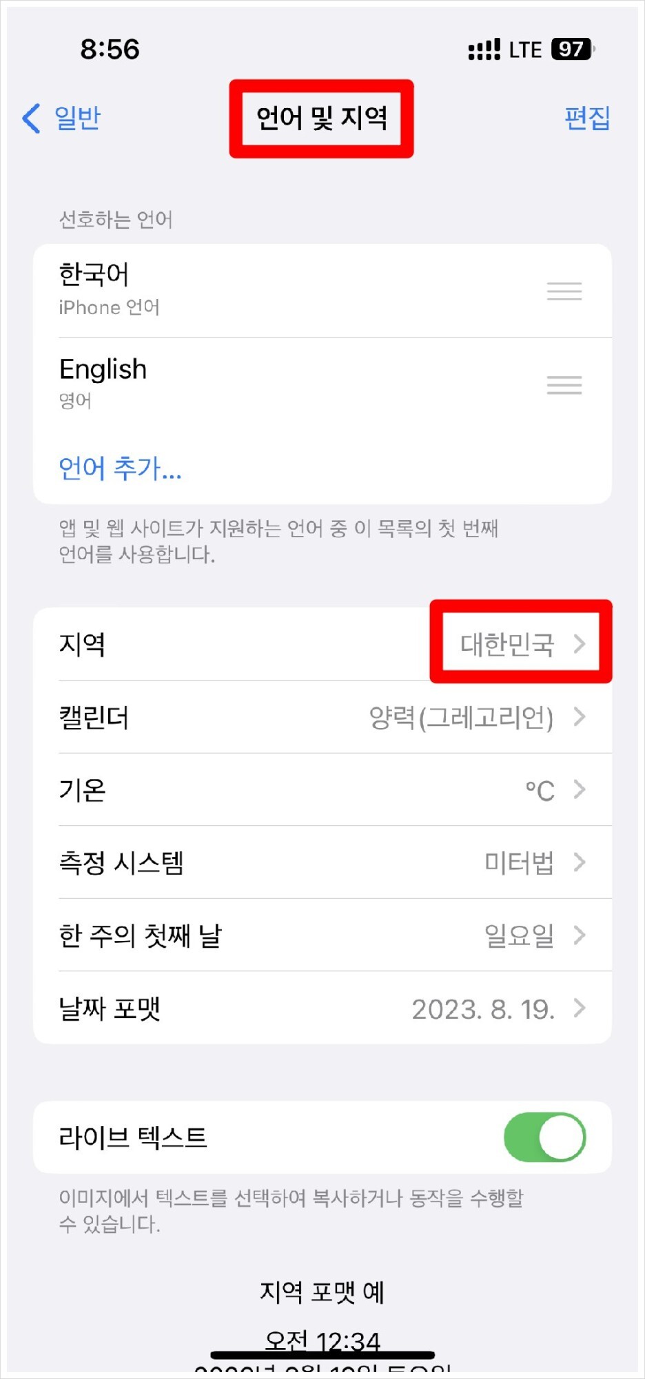 이럴때는 [설정 > 일반 > 언어 및 지역] 으로 이동해서 지역을 선택한 후,