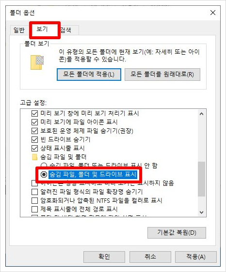 [보기] 탭을 선택한 후 [고급설정]에서 아래로 스크롤해서 [숨김 파일 및 폴더] 옵션을 '숨김 파일, 폴더 및 드라이브 표시'로 선택하고 [적용] 버튼을 클릭합니다.