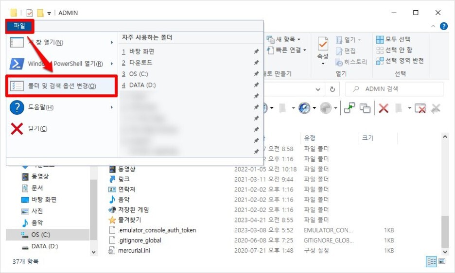 탐색기 왼쪽 상단의 [파일]을 클릭한 후 [폴더 및 검색 옵션 변경]을 선택합니다.