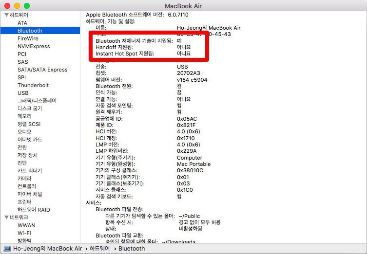 handoff 및 Instant Hot Spot 기능이 지원되지 않는것을 확인할 수 있습니다.