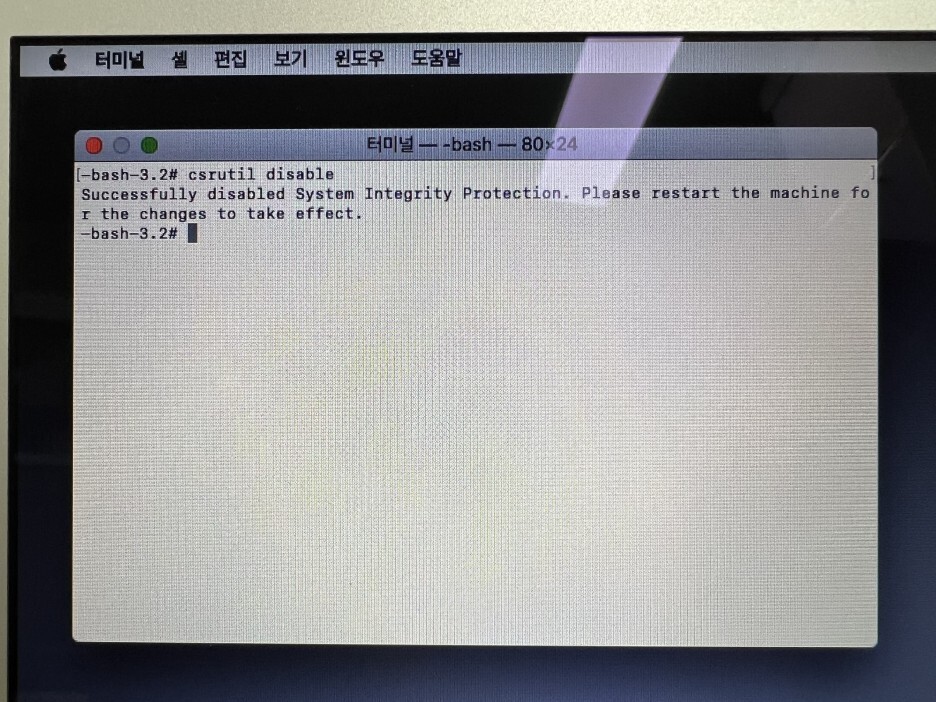 5) 터미널에서 reboot을 입력하여 맥북에어를 재부팅 합니다.