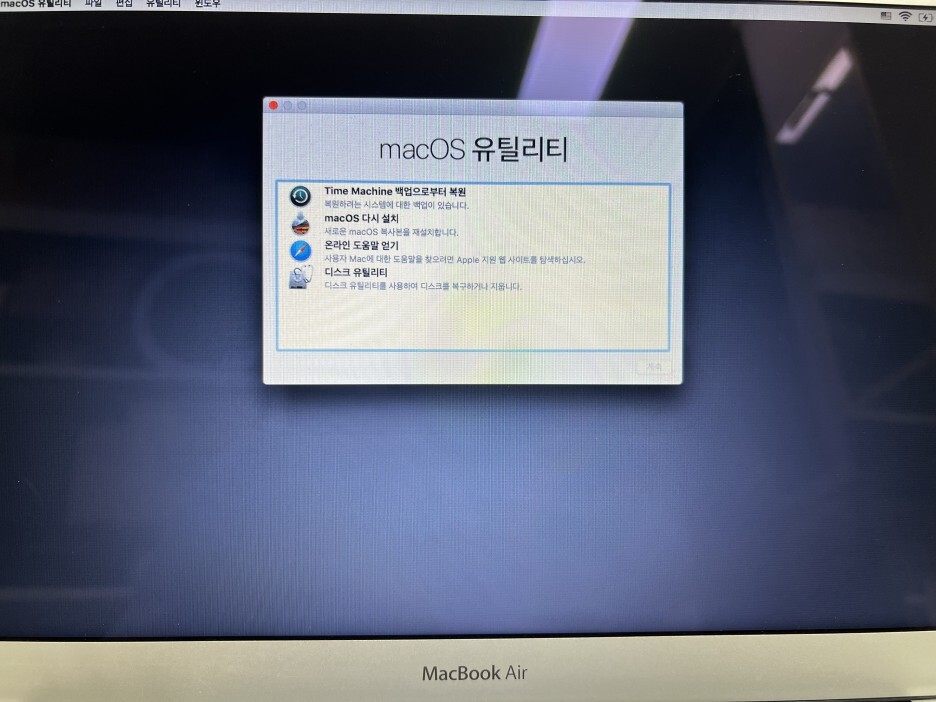 2) 재부팅시 Cmd+R 버튼을 Apple 로고가 뜰 때까지 누르고 있으면 Recovery Mode로 진입합니다.