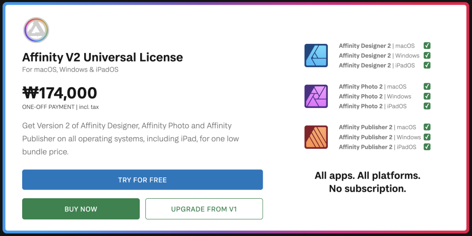 어피니티 Affinity v2 미친 할인 Universal License 32,000원에 구매하기