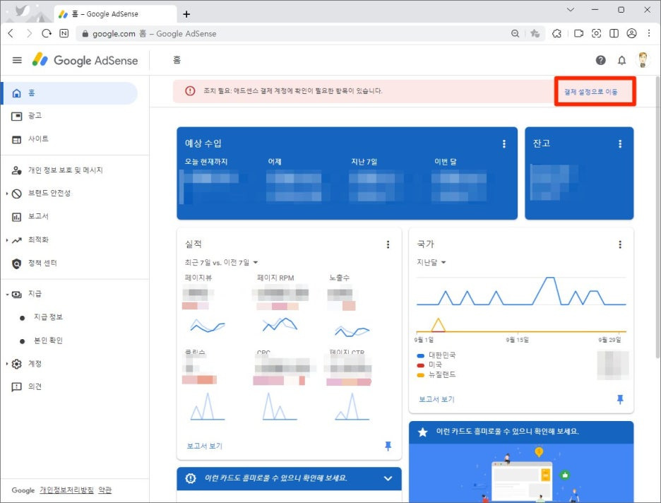 애드센스 사이트에 빨간색 경고가 또 떠있습니다.