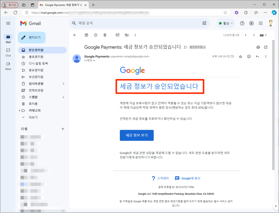 1~2일 후에 '세금 정보가 승인되었습니다.' 라는 메일이 도착합니다.